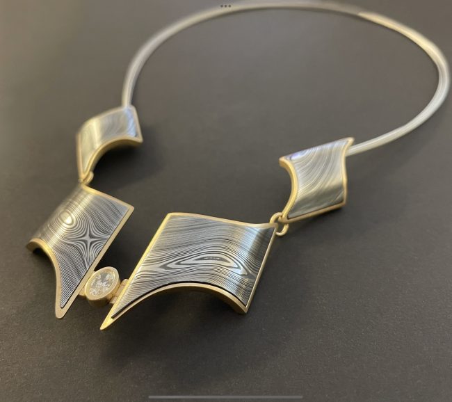 Spezielle Anfertigung nach Kundenwunsch Collier in 900 Gelbgold mit Damaststahl Collier in 900 Gelbgold mit Lagendamast Ein außergewöhnliches Collier, angefertigt nach Kundenwunsch in 900 Gelbgold mit Lagendamast. Vorne mittig sitzt ein ovaler Diamant tw/vvsi in einer Zargenfassung, durch Scharniere beweglich zwischen den zwei großen Damast-Platten. Alle Collier-Elemente sind durch Ösenverbindungen beweglich und passen sich dem…